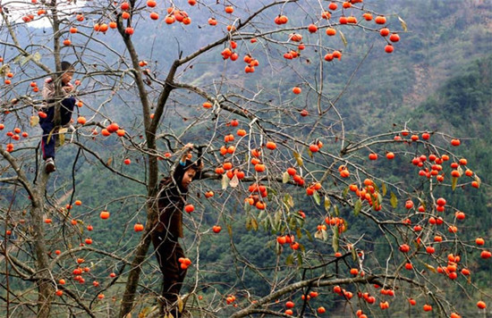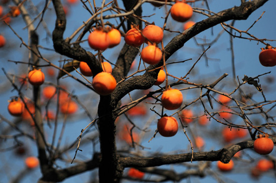 這里是柿子的天堂,房前屋后,嶺上溝邊,到處都是或粗壯或挺秀的柿子樹,紅彤彤的柿子長滿了枝椏,恨不能一下子壓彎了柿樹的老腰。楊樹溝的柿子隨摘隨吃,軟甜可口,一口下去,飽滿的汁液就會讓人口齒留香!