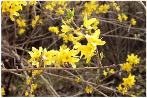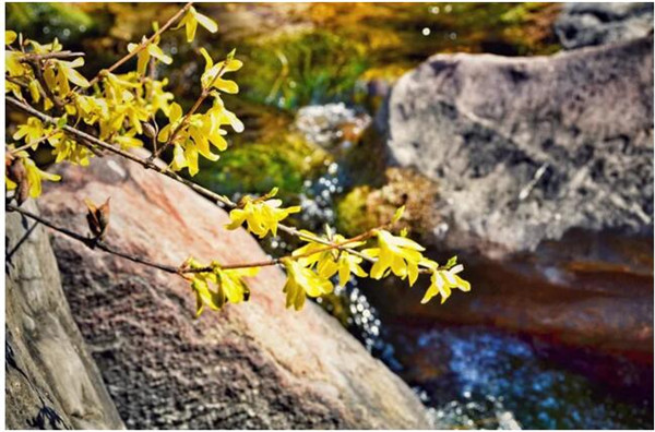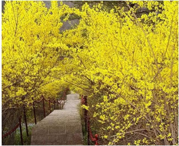 2、賞花:陽春三月的關山景區,綠如海,花如潮,青松滴翠,黃花怒放,大地披綠,山川葳蕤。極目所至,那漫山遍野的連翹花燦若金色云霞,閃耀著生命的靈動,煥發出勃勃生機。