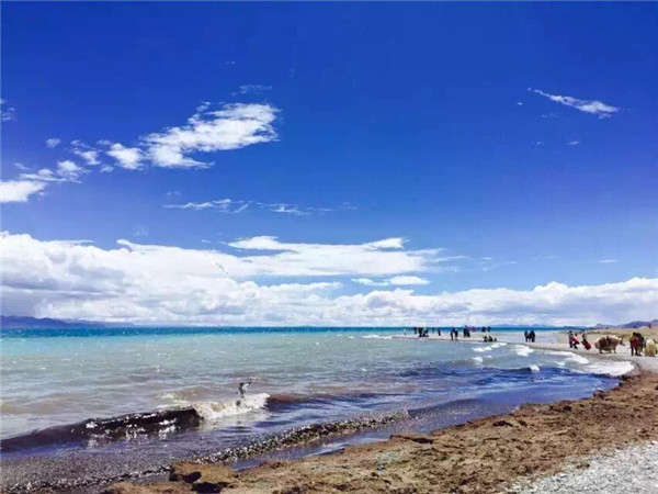 馳騁當雄草原,翻越5100米的納根山,抵達世界最高的咸水湖納木措,環顧一望無際的藏北大草原,雪山連綿,藍天白云。納木措,藏語意為“天湖”,湖面海拔4718米,總面積為1900多平方公里,是我國的第二大咸水湖,最深處約33米。