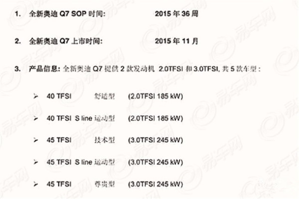 日前有國內(nèi)媒體曝光,奧迪新一代Q7將于今年11月初在國內(nèi)正式上市,新車或?qū)⑼瞥鰞煞N排量共計5款車型,其中奧迪將針對中國市場推出搭載2.0TFSI的車型。