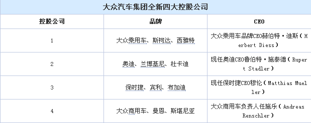 大眾汽車集團(tuán)目前旗下共有12個(gè)品牌:大眾乘用車、斯柯達(dá)、西雅特為普通乘用車品牌;奧迪、保時(shí)捷、賓利為豪華/超豪華品牌;蘭博基尼、布加迪為超豪華跑車品牌;大眾商用車、曼恩、斯堪尼亞為商用車品牌;杜卡迪為摩托車品牌。這12個(gè)品牌也都將分別屬于四家控股公司所有。
