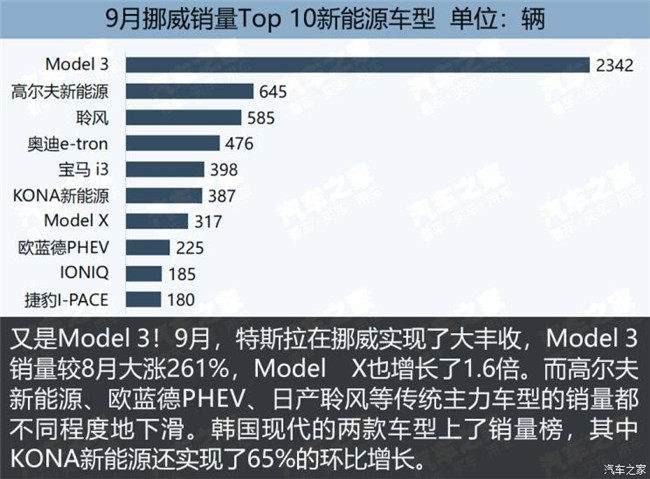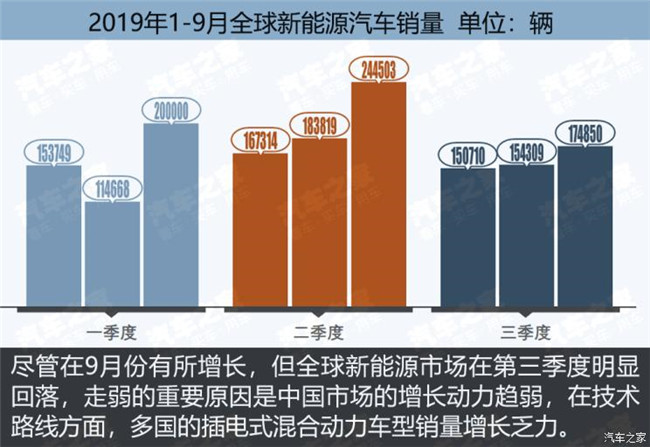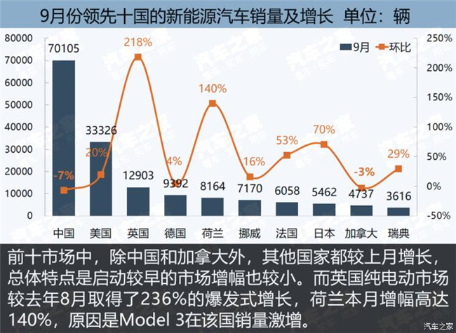 9月份全球新能源乘用車銷售17.5萬輛,較8月銷量增長13.3%,其中純電動車型13.2萬輛,插電式混合動力車型4.2萬輛,另外還有721輛燃料電池車。看上去還算樂觀嗎?其實,最大的市場——中國和美國——都增長乏力,電動化率最高的挪威,也有點漲不動了,拉動市場向上的主要是一些新能源汽車新興市場,而這些市場一個月也賣不了幾千輛車。9月份、以及今年前三個季度,全球新能源汽車市場還好嗎?本期圖觀車市為您呈現。
