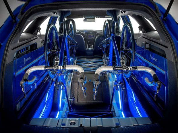 從上圖我們看到,這款概念車將第一排座椅往后的空間進行了改造,并在地盤上安裝自行車專用固定架,可以實現兩輛自行車橫向同時擺放,并且可以正常關閉尾門。此外,新車還將配備專用工具箱、同時行李廂蓋內增加遮陽板,可以實現伸縮。