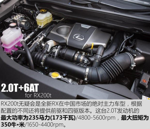 動力部分,全新RX將會提供兩種動力系統(tǒng)供消費者選擇。RX 200t車型搭載的是2.0T渦輪增壓發(fā)動機,這款發(fā)動機的最大功率為235馬力,峰值扭矩為350牛·米,其匹配6速手自一體變速箱,提供前驅和四驅系統(tǒng)可選;RX 450h配備的是3.5L V6自然吸氣發(fā)動機+前后軸雙電機,這套動力系統(tǒng)的綜合輸出功率為313馬力,峰值扭矩為335牛·米,匹配ECVT變速箱。