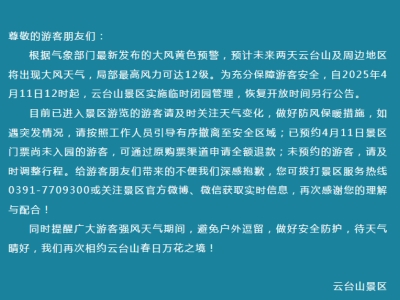 4月11日,河南省氣象臺發布大風黃色預警,預計未來兩天全省多地陣風可達10-12級,局地風力達12級以上123。受極端天氣影響,云臺山、紅旗渠、五巖山等景區緊急閉園,老君山、寶泉旅游區啟動限流措施,洛邑古城暫停部分演出。各景區詳細公告如下: