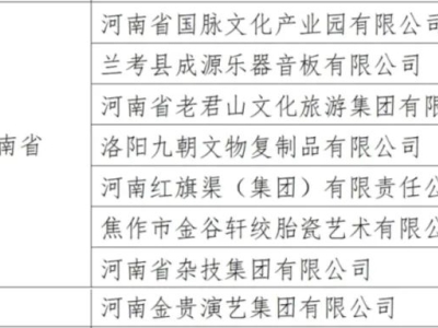 3月12日,文化和旅游部產(chǎn)業(yè)發(fā)展司發(fā)布新一批國(guó)家文化產(chǎn)業(yè)示范基地?cái)M命名名單、擬保留命名國(guó)家文化產(chǎn)業(yè)示范基地名單。其中,河南省8家企業(yè)入選新一批國(guó)家文化產(chǎn)業(yè)示范基地?cái)M命名名單,6家企業(yè)入選擬保留命名國(guó)家文化產(chǎn)業(yè)示范基地名單。