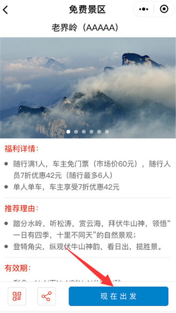 此外,點開您要自駕去的目的地景區,除了景區的美景圖片和重要提示外,還有方便快捷的導航服務—點擊右下角的“現在出發”,就可以調用您手機上的電子地圖,直達景區入口。
