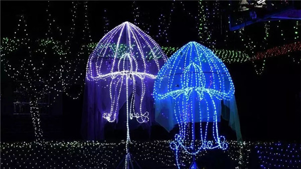 在華燈初上的五彩大地燈光展,置身于流光溢彩中,看海豚跳躍、晶瑩剔透的水母、舞動的水晶鞋、相互依偎的幸福戀人、還有彩蝶飄飄、純潔的白天鵝、閃到爆的大鉆石……