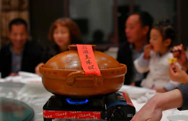 最能代表千島湖的菜非千島湖魚頭莫屬了,同時(shí)也是魚味館的鎮(zhèn)店菜。一個(gè)超大的砂鍋里裝著一個(gè)4斤左右的千島湖魚頭,經(jīng)過幾個(gè)小時(shí)的燉煮,魚湯已經(jīng)成奶白色,上面還有一層薄薄的魚油。這魚湯爽滑可口,魚肉油潤滑嫩,這應(yīng)該是我吃過最好吃的魚頭湯了。雖然只是簡單的燉煮,但毫無泥腥味,應(yīng)該和千島湖優(yōu)越的水質(zhì)有直接的關(guān)系。看大家的表情就知道有多好吃了。