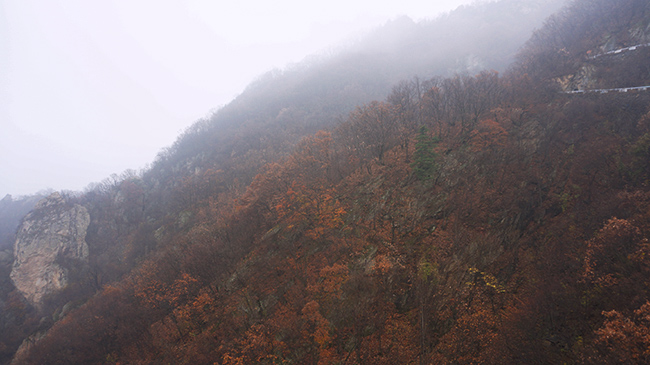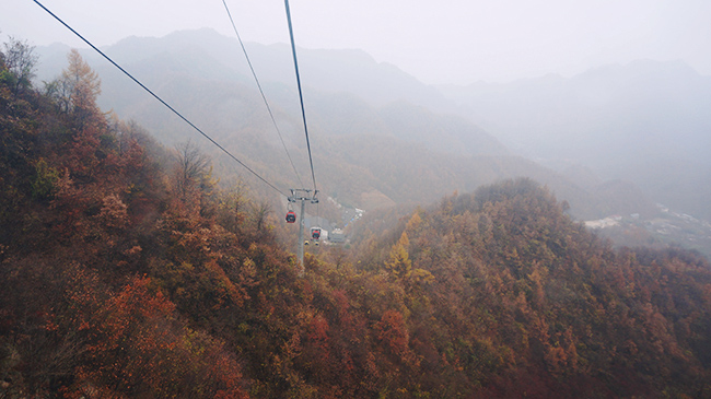 不同于老君金頂,這里的秋意正濃,似是另外一個(gè)世界。輕霜漫透山野,楓葉染紅層林!
