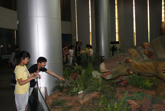 展廳內小朋友們好奇的觀看恐龍模型