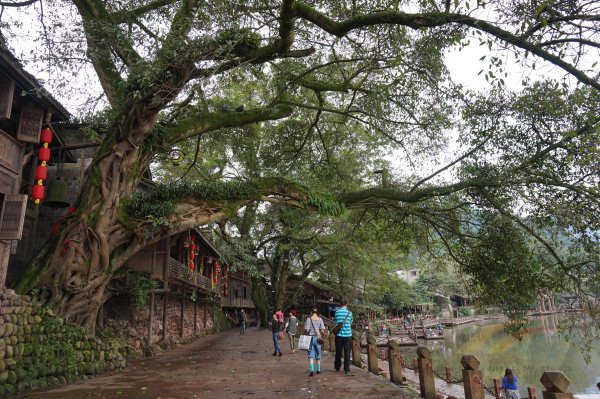 柳江古鎮建于南宋,與現代建筑一水之隔的是明清時代的建筑。一座座古樸的木板房吊腳樓依著根枝盤錯的黃葛古樹,木板房半邊街的盡頭,連接著一條石板長街,不著一字,盡現街道的滄桑古樸。