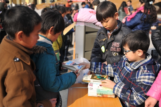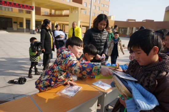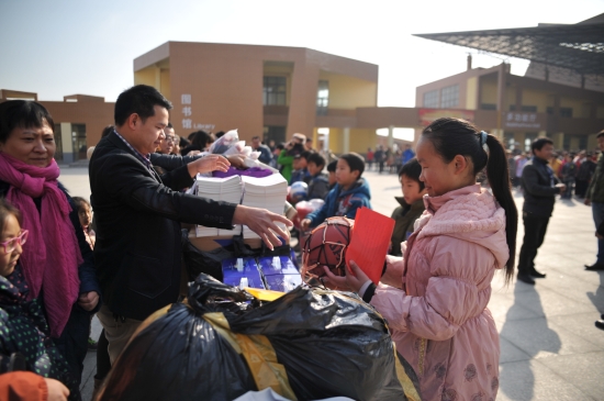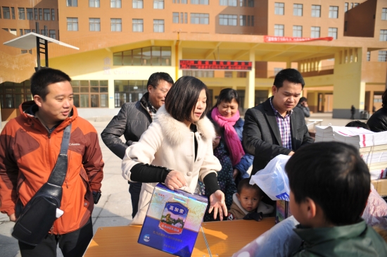 河南花花牛乳業的代表王真真為貧困兒童逐一分發了花花牛新乳制品——高加索。