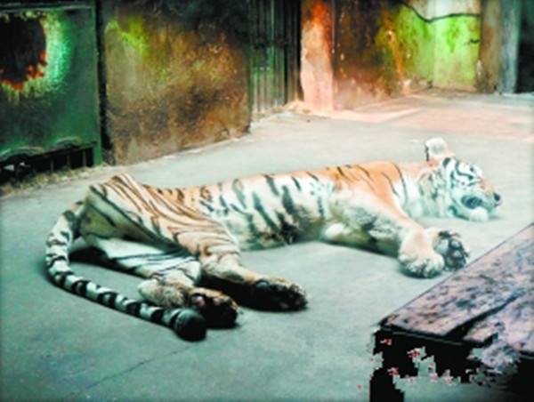 記者2日在天津動物園獅虎山館內看到,該虎與周圍其他8只老虎相比,體型消瘦,無精打采。