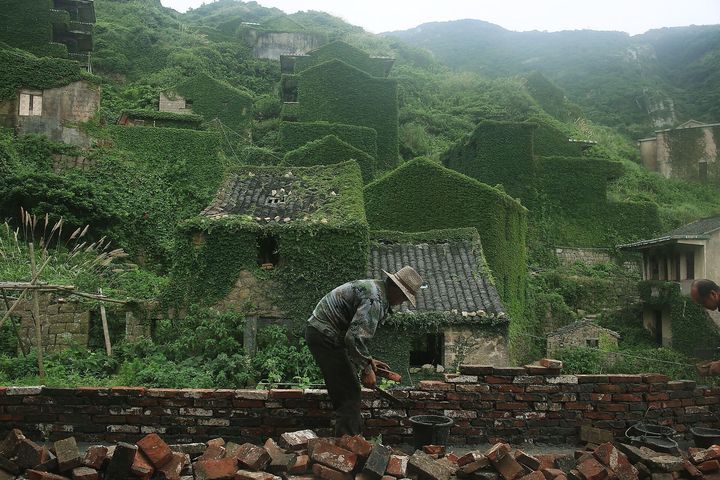 后頭灣村位于嵊山島東北面,上世紀八十年代,很多人家開始搬離。2002年,后頭灣整村搬遷,撤銷建制歸并至民富村。村民搬到新居后,廢棄的老屋任由植物將它慢慢“吞噬”,村落變成令人意想不到的模樣。
