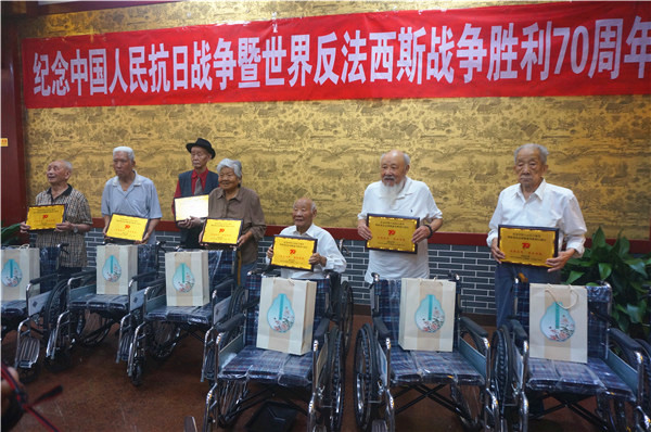 開封軍分區(qū)政治部主任白江民,開封市政協(xié)原副主席、市社會救助協(xié)會會長張秀珍,開封日報報業(yè)集團(tuán)黨委委員、副總編輯、汴梁晚報執(zhí)行總編輯蔡小俊,清明上河園總經(jīng)理周旭東等出席此次活動,共同為7位抗戰(zhàn)老兵代表頒發(fā)抗戰(zhàn)勝利70周年·抗戰(zhàn)英雄紀(jì)念牌,同時贈送輪椅、贈送清明上河園限量版郵票等紀(jì)念品。
