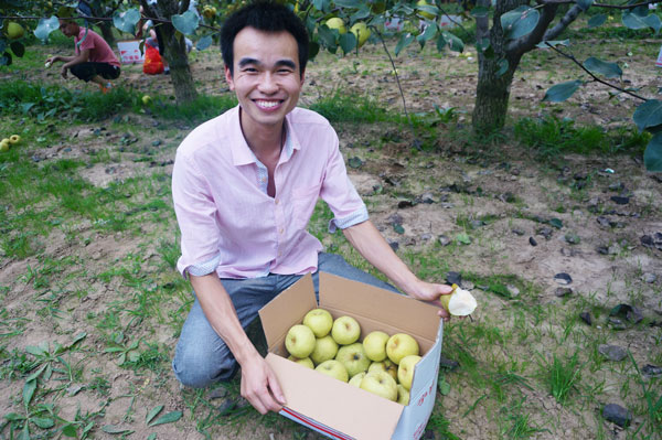 成熟的酥梨色澤金黃、皮薄汁多、香甜酥脆,看這位車友吃的多開心啊
