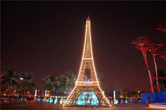 2015年10月19日,近日,海南省海口市海甸溪旁冒出一座山寨“埃菲爾鐵塔”引起了市民關(guān)注。據(jù)現(xiàn)場看護(hù)人員介紹,這座山寨版“埃菲爾鐵塔”高約20米,外表刷金色油漆,晚上還有輪廓燈,主要是供市民觀賞拍照。
