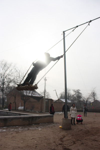 地坑院旁一個老鄉在蕩秋千,周圍車友都紛紛豎起了大拇指,蕩這么高,實在太厲害了!