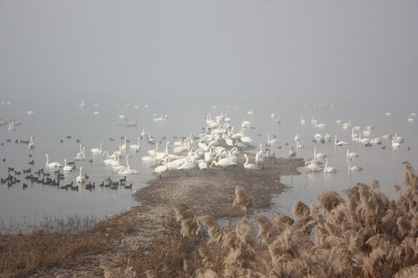 十一點多,大霧散了些,車隊又回到天鵝湖。這次,終于可以看到白天鵝的廬山真面目。