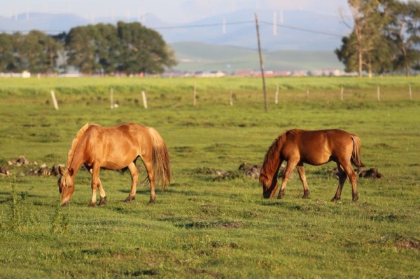 遼闊的烏蘭布統大草原,藍天白云下,駿馬奶牛悠閑的吃著青草!